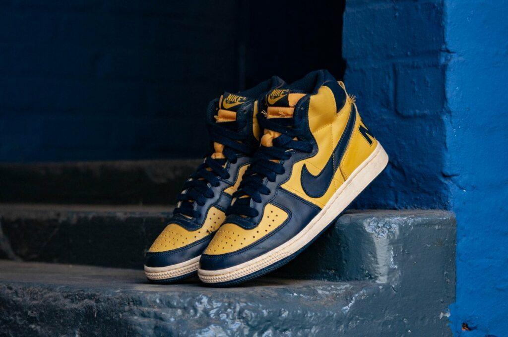 Ce dernier l’avait initialement nommée “College Color High”, en référence aux couleurs emblématiques des universités américaines et à la coupe haute (High) du modèle. C’est pourquoi les coloris originaux de la Dunk reprennent le code couleur des universités mythiques que sont Georgetown, Michigan, Syracuse, Kentucky, UNLV ou encore St. John. Le Swoosh a d’ailleurs conclu un partenariat équipementier avec 12 de ces établissements scolaires, nommé “College Color program”, de quoi ravir les athlètes et les supporters. Niveau design, la silhouette est inspirée de la Air Jordan 1, sortie quelques mois plus tôt, et d’un modèle beaucoup moins connu qu’est la Nike Terminator ! Elle s’inscrit donc dans l’ère du basketball des années 80, tout en présentant des innovations pour la performance.