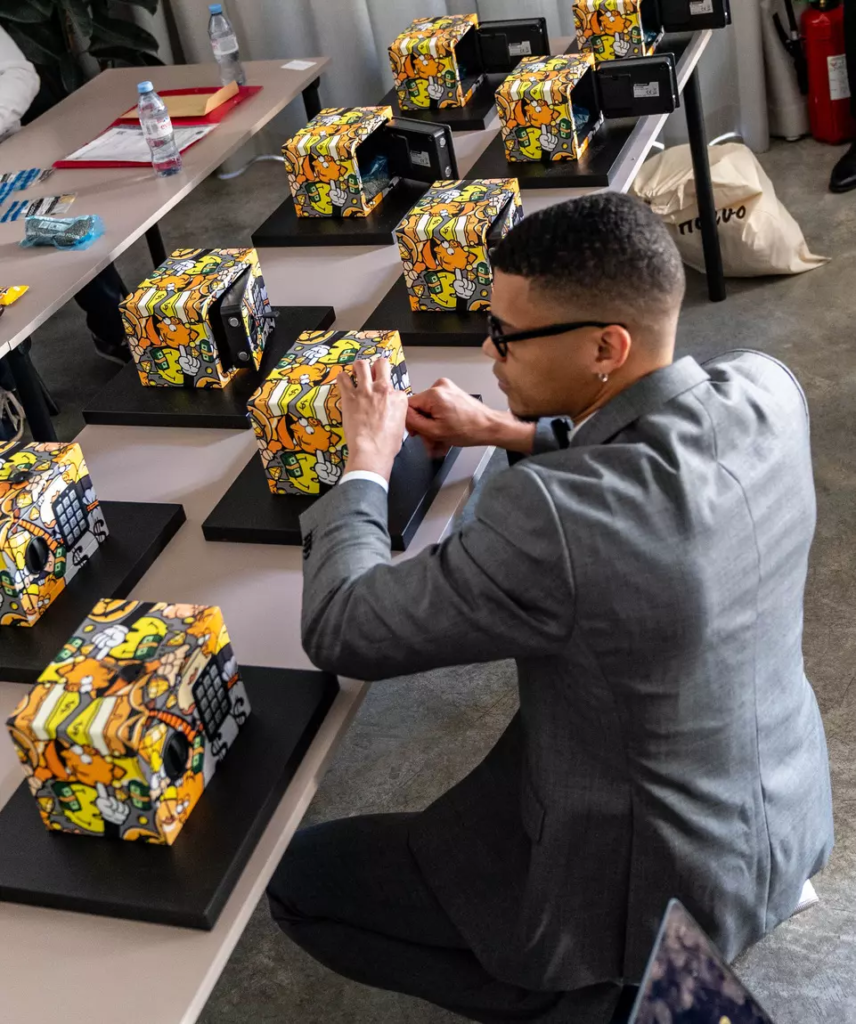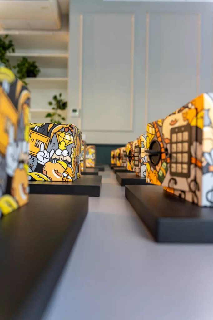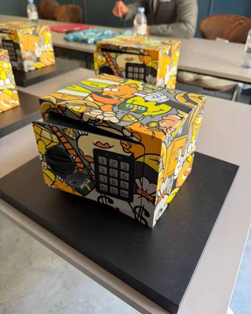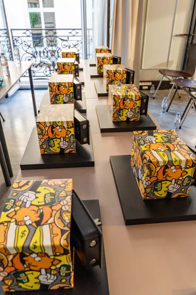 Alors que, à quelques rues de là, le Grand Palais célébrait l’ouverture d’Art Paris, rendez-vous incontournable du marché de l’art contemporain, un cercle restreint de journalistes et de professionnels était convié à une expérience bien plus confidentielle. Et rien, à première vue, ne distinguait cette journée d’un rendez-vous mondain de l’art contemporain. Pourtant, derrière la sobriété du dispositif se jouait une scène presque cérémonielle. Alignés avec une rigueur quasi liturgique, dix coffres-forts miniatures faisaient face aux invités. Dix coffres-forts, strictement identiques, posés sur des socles noirs mats et habillés de coverings aux teintes noir, jaune orangé, jaune, vert, marron clair, gris clair et gris foncé, subtilement customisés par l’artiste Paul Honvo lui-même, et représentant un personnage récurrent nommé Moogy, une figure inspirée de la culture pop et des cartoons américains, qui accompagne ses interventions urbaines et symbolise sa réflexion sur les paradoxes de la société contemporaine. Un mouton anthropomorphe alter ego de l’artiste, déjà à l’honneur lors de sa dernière œuvre “Ascension”, présentée à Lyon le 17 avril 2025.