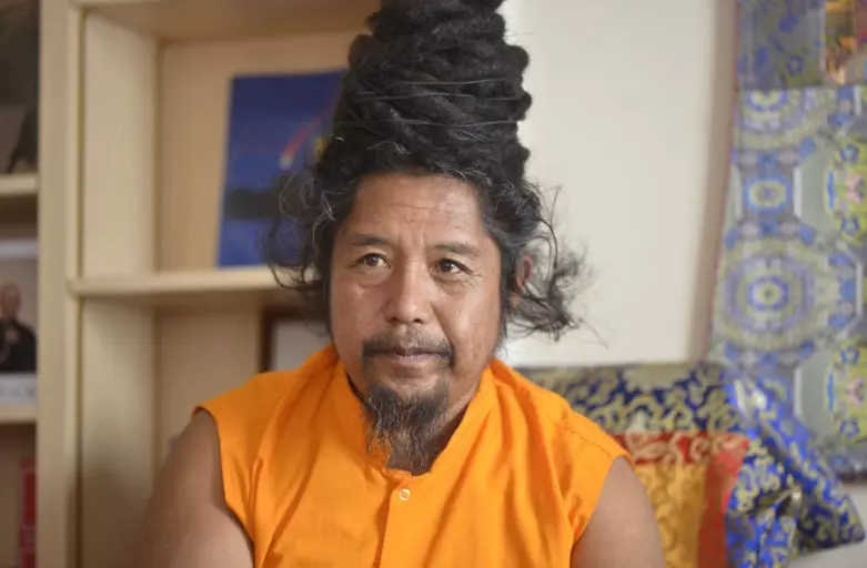 C’est un homme jovial qui nous accueille ce 9 juin 2025, le regard pétillant et le sourire facile. Sa silhouette paisible est coiffée de longues mèches, semblables à des dreadlocks, traces visibles d’années de retraites et de pratiques ascétiques. Son rire est fréquent, sa parole mesurée. Ses cheveux, longs et noués sur le sommet de sa tête, comme des lianes de silence, rappellent les ermites des montagnes, ceux qui renoncent au monde sans jamais cesser de l’aimer. Ses longues mèches, formées au fil des années, évoquent surtout les yogis de l’Himalaya, dont l’apparence témoigne d’un détachement profond plus que d’une volonté d’affirmation.