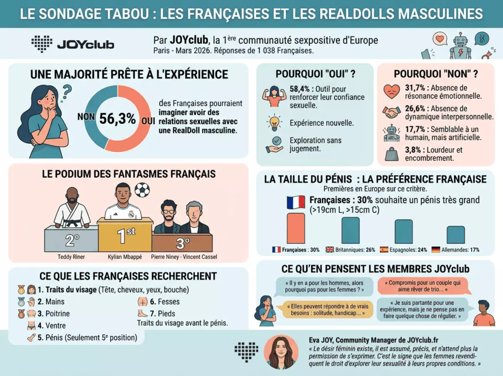 Un visage avant un sexe. Une présence avant une performance. Selon un sondage mené en février 2026 par JOYclub auprès de 1 038 Françaises, 56,3 % d’entre elles pourraient envisager une relation sexuelle avec une poupée masculine hyperréaliste. Une petite révolution culturelle, qui n’est pas révélatrice d’une fascination pour le silicone, mais qui témoigne d’un basculement profond du regard féminin sur le désir, le corps et la relation.